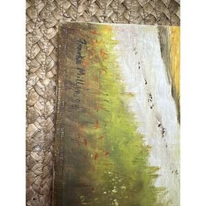 This vintage original painting depicts a rustic barn and country road, with a landscape theme and impressionism style. The painting is signed by M Frankie Miller and is a medium-sized board painting with a framed feature. It measures 12 inches in length and 9 inches in width, and was produced in the 1990s in the United States. The painting is a unique Americana piece that portrays a charming and serene scene, perfect for adding a touch of nature to any home or office.