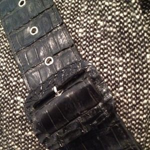Brand new black crocodile leather messenger bag. The inside is suede and has one medium sized zipper pocket and two cell phone sized pockets. There are two magnetic snap closures where the flap and the main part of the bag meet. So, you don't have to worry about the snap coming undone and all of your stuff spilling out! Great engineering! The 21" strap has an adjustable buckle to make it longer or shorter. You'll LOVE this satchel! It's big enough to carry a tablet or small laptop. 17"L 13"H