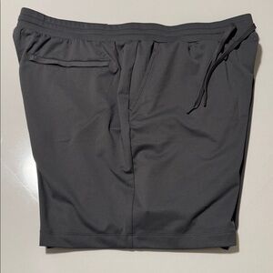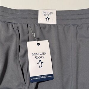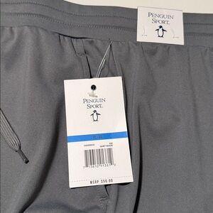 This is new with tags. The color is gray. The fabric is 100% polyester. Zip side pocket. 2 side pockets. The outer drawstring waist is 40 inches stretches to 50 inches. The length from top to bottom is 18 inches. The inseam is 7 inches. The brand is Penguin Sport by Original Penguin. These are heavy and well made.