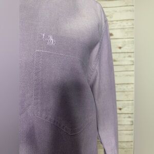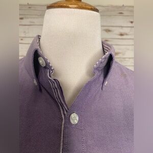 Lavender; button-down collar; 7-button placket; long sleeves w/ buttoned cuffs; upper chest pocket w/ embroidered logo; shirttail hem