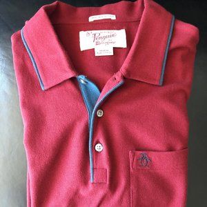 Original Penguin polo shirt with dark blue piping along the collar. Men's size medium. Great condition.