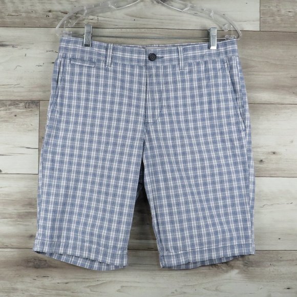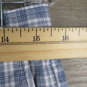 Pre-Owned Condition! 100% Cotton. Handsome Blue & White Plaid Flat Front Multipocketed Bermuda Shorts with Matching Glossy Blue Buttons.