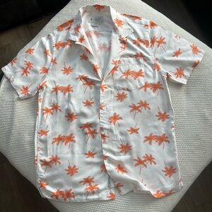Embrace a relaxed vibe with this Original Penguin shirt, featuring a crisp white base adorned with vibrant orange palm tree prints. Its casual button-down style and camp collar make it an ideal choice for leisurely outings.