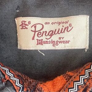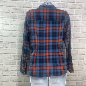 Multicolored plaid, button up, double button cuffs, one chest pocket with penguin logo, logo tag on bottom of buttons at hem, colors may vary due to lighting, good used condition, Large