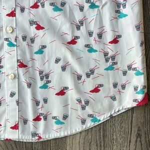This slurpee print poplin shirt will bring you back to your childhood when the slurpee machine at your local convenience store was the coolest thing in the neighborhood. Pay homage to these nostalgic times with a shirt built to wrinkle less and made with 100% cotton, so you stay comfy and looking good with no extra effort. Stay cool during the summer months, both in body and spirit.