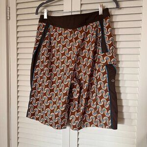 Original Penguin men's board shorts/swim trunks. Brown geometric pattern. Size 30. Gently worn, in excellent used condition. No rips, stains, or tears. Lace-up closure at waist.