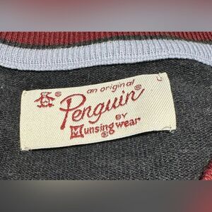 Great casual v-neck Original Penguin cotton sweater is charcoal gray and features baby blue, navy and maroon striped trim at neckline, wrists and waist. It’s in awesome gently worn condition, the size large measures as follows: