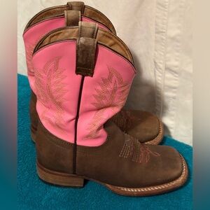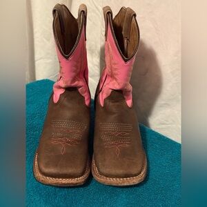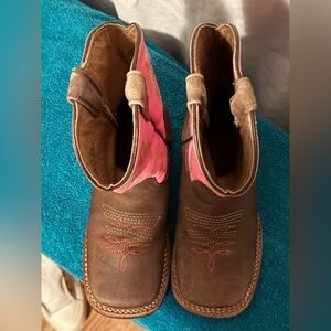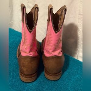 These are Original Ranchers Kids Leather Cowgirl Boots in Size 12.5. Straight from Texas, these mid-calf boots feature a brown and pink color scheme with a western style and a low heel height. Made of leather with a pull-on closure, these comfortable boots are perfect for riding and have a leather lining and outsole. Ideal for young cowboys and cowgirls, they exude a Texas cowboy/cowgirl theme.