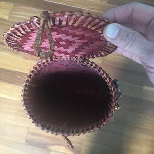 Redish original back bucket purse made of rattan. Approximately measurements are: height: 8 1/4", diameter: 6 1/3"