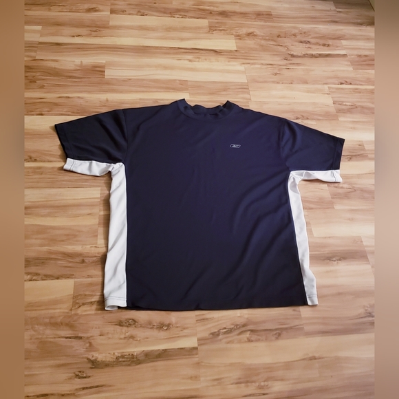 Original Reebok navy & white pullover tee. Made of 100% polyester. Across chest area measures 22 inches, the sleeves measures 8 inches and the length measures 29 inches