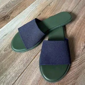 These slides never made it to production due to some errors, but I can guarantee these are authentic and frankly, one of a kind. Perfect for the deep Rothy's fan. Green footbed with navy upper in signature Rothy's knit. These were designed in 2018. Own a piece of Rothy's history!