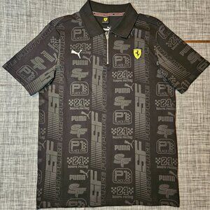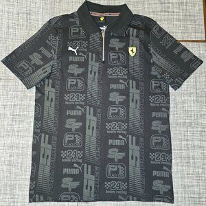 This timeless polo silhouette combines motorsport accents with a zip neck for easy wear. The Scuderia Ferrari all-over-print graphic and Scuderia Ferrari shield and PUMA Cat Logo on the chest make a statement wherever you go. The shirt is adorned with various racing-themed graphics and logos, including the iconic Ferrari shield on the left chest, the Puma logo on the right chest, and multiple "P1 Place One," "24 hours racing," "SF," and "FAST PLACE" motifs throughout the fabric. The collar is black with a zipper closure, and the inside of the collar has "SCUDERIA FERRARI" text. This polo shirt is perfect for motorsport enthusiasts and fans of the Ferrari racing team.