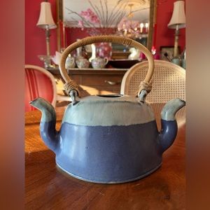 Original Signed Pottery Double-Spouted Teapot Stoneware 2-Tone Light and Dark Blue glaze with Bamboo Handle.
