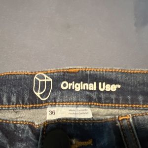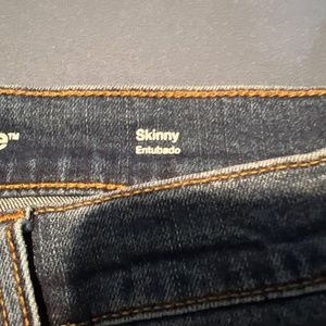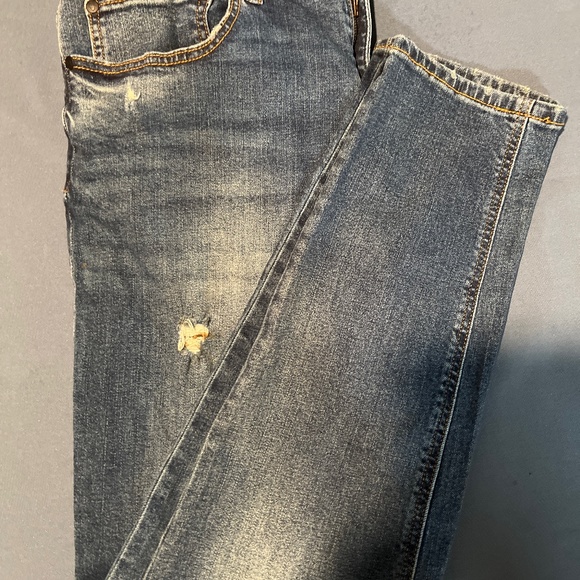 Medium Blue with lots of fade. Some distress. Skinny. Size 36/30. Inseam 9. Lots of stretch.