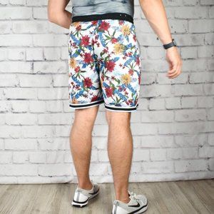 Rad Original Use shorts feature allover tropical print on super soft jersey material, full satin lining, elastic and drawstring waist, and accent trim at hem. Minor pilling on waistband, otherwise no defects or flaws.