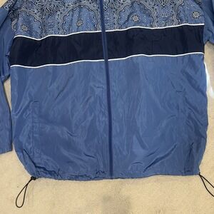 Blue and white bandana print paisley windbreaker rain jacket light weight with zipper front, pockets, and hood. Good condition. Size XL. See photos for condition.
