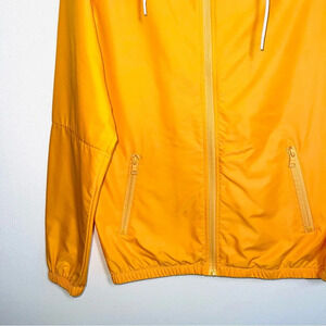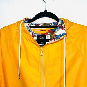Original Use yellow orange floral hood windbreaker jacket. In excellent condition! Full zip front closure. Hooded with drawstring closure. Mesh lined hood with white & multicolor floral print. Long sleeves with fitted cuffs. Zip closure front pockets. Packable material. Orange yellow color. Size xsmall.