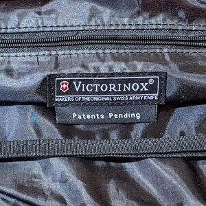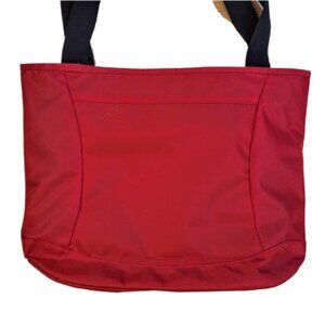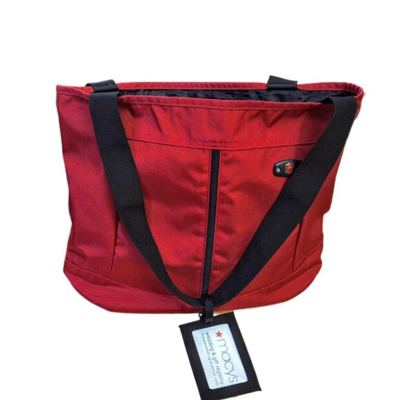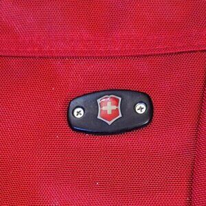 Victorinox red tote shoulder bag 12" high by 16" wide and 3 1/2" across at botom. Made of high nylon fabric, reinforced at bottom,black polyester lining and black polyester top handle. 5" x 5" zippered pocket on top inside edge of bag. 3 compartments, one center and one on either side. Bag is extreamly heavy duty an Victornox quality. Interested, make an offer. From a smoke and pet hair free home. Fast shipping.