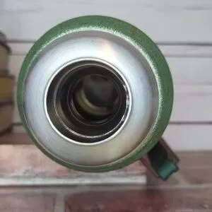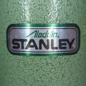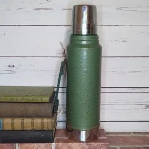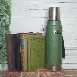 Made in the USA, this thermos features a durable metal construction and is adorned with the iconic Aladdin Stanley branding. Whether you're a fan of Thermos products, the iconic Stanley cups, or good old fashioned American-made goods, this thermos is sure to make a statement. Used as decor with a stack of vintage books, this piece is a perfect addition to a home library, office, kitchen, den, or man cave. Comes with stopper and cup that is also a lid.