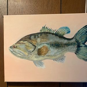 Large Mouth Bass with Pale Pink Backdrop, multiple prints available. Ask me about Custom paintings .Thank you for your interest💞