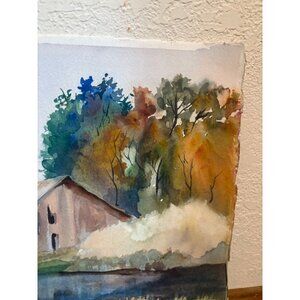 This original watercolor painting by Phyllis Sykes captures a serene landscape with a rustic barn, lush trees, and peaceful waters. The artwork's vibrant colors and delicate brushwork evoke a tranquil countryside scene, making it a distinctive piece for art collectors or as a refined addition to any space.