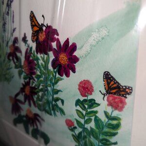 I painted it. I had it framed professionally with a wood frame. It is a watercolor painting of Monarch butterflies in a residential Monarch Waystation Garden in Kentucky. The flowers are Lavender, Coneflower and Milkweed which are all plants that the Monarch loves.