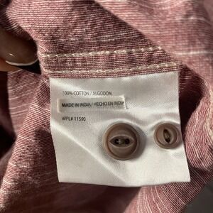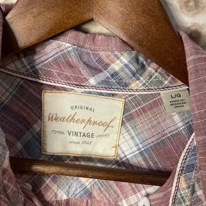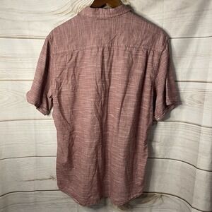 The Original Weatherproof Vintage Men's Short Sleeve Shirt in red, size large, features a classic striped pattern with a collared neckline and button closure. Made from cotton chambray fabric, this button-up shirt is machine washable and designed for easy care. It has a regular fit and button-down collar style, as well as lightweight and comfortable features. Perfect for casual wear, this shirt is a stylish addition to any man's wardrobe, offering both durability and style.
