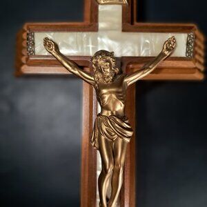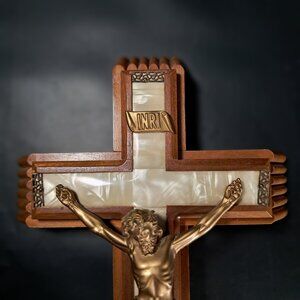 A very nice condition 1960s, 70s Divinity crucifix sick call cross with original instructions. Priestly duties Sick call rights. These crosses crucifix would normally contain beeswax candles, a bottle for holy water and cloth among other things. This one comes with two candles, anointing cotton swabs and instruction sheet. Cross slides open to reveal contents described above. Has a notch in the wood cross backside to hang. Medium colored wood cross, plastic, faux mother of Pearl inlay. In great vintage condition. No cracked parts, chips or damage. Measures 13.25 inches tall, 7.5 inches wide, 2.5 inches thick. Non-smoking pet free home.