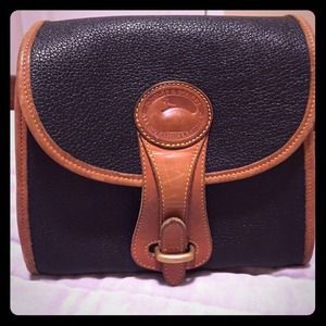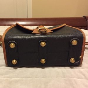 Black leather with brown trim. Gold hardware, back pocket, loop closure, zipper pocket inside and 2 smaller closures. Has Dooney signature charm attached. Some wear but in great condition! A real gem!