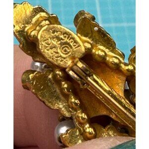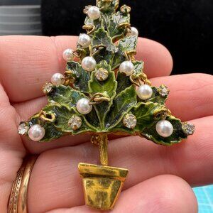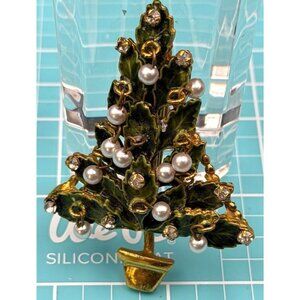 Pictured is an Original by Robert Enameled Christmas Tree Brooch Faux Pearls Dangles Signed