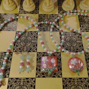 Cremosa Fiori - Handcrafted necklace and earrings with aventurine and glass "pearls" in an exquisite setting with Grace Lampwork focal (in either square or round versions - please specify) featuring creamy flowers on coral pillow - 18 inches + 2-inch extender, lobster-claw and French hooks.
