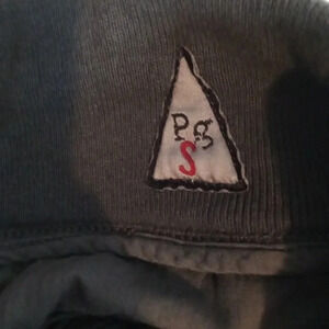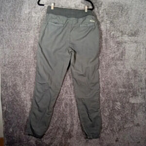 this pants are cotton linen blend pants. there soft n comfy, pull on elastic waistband..adjustable strings ..two front n back pockets. they are in color dark gray. they have white soap stain on the waist. I'm sure it can come off as washed...approx measurements Rise:13" length"31" long waist:14" ..measurements are taken flat lay..