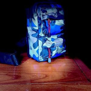 Army fatigue (Green,black, and blue) Black strap. Double hide away zipper