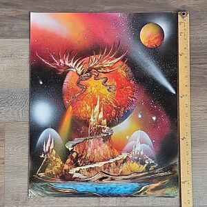 An original science fiction landscape of dragons and castles in beautiful mixed media colors on canvas board, including what looks like some spray paint art. It's signed on the bottom right corner, which looks like "Azul" 2006. Great condition and measures 15.5" X 19.5"