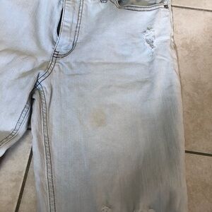 Original use highly distressed light wash jeans, size 34, large distressing holes/rips on front knees, stain on left leg, marking on left back pocket, right back pocket is ripped halfway as shown, these jeans are amazingly comfortable and on trend!