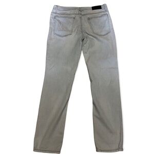 Original use highly distressed light wash jeans, size 34, large distressing holes/rips on front knees, stain on left leg, marking on left back pocket, right back pocket is ripped halfway as shown, these jeans are amazingly comfortable and on trend!