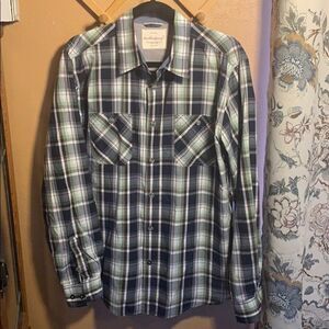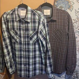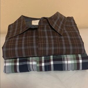 2 plaid long sleeve button up shirts. Brown shirt is missing a button. See pics. Otherwise both shirts are in amazing condition. Both shirts also come with an extra button.