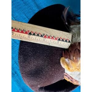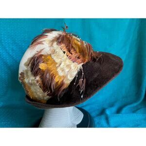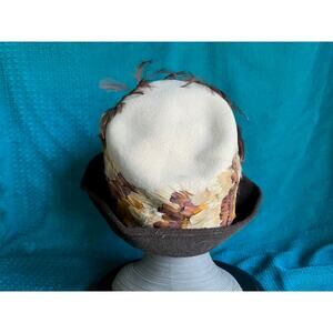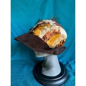 Originals by Mr josephs hat felted wool wide brim feathered brim is brown and crown of hat cream with feathers around the sides. measures 8” across.tag says Originals by Mr josephs new york. union made.