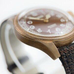 Condition: The watch is in pre-owned condition. Crystal has a minor scratch as seen in the photo. There is some patina on the bronze case. The hybrid strap is in good condition with lots of life left. Overall the watch is in nice shape.