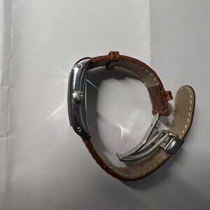 Oris 326 Oris Miles rectangular stainless steel, brown leather deployment strap, silve dial, automatic, date, sapphire crystal, display back. Water resistant 30m. Reference number 583-7525-40-61, 28x45mm. In box with papers.