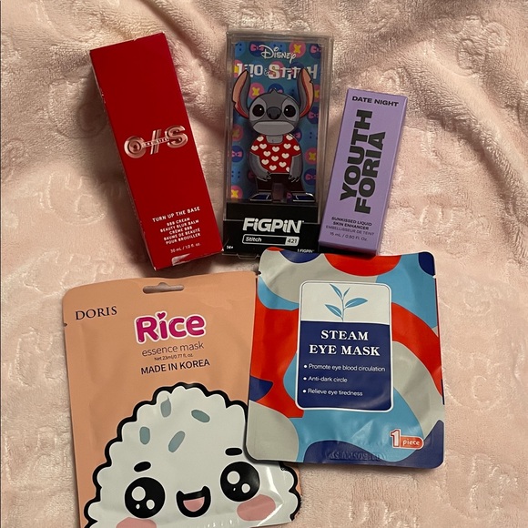 1 rice mask, 1 steam eye mask, one size bbb cream (Fair 1) 1.0 fl oz, youth foria (radiant) .50 fl oz and 1 Stitch Figpin