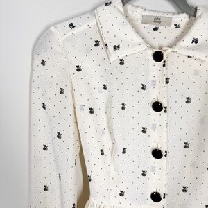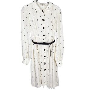 Chic long sleeve dress by Orla Kiely. Features a white base with black cat print. Button-down front and belted waist. Perfect for stylish outings.