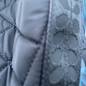 Top zip closure, double adjustable shoulder straps, main entry snap closure, center tab snap to adjust bag shape, quilting design on sides