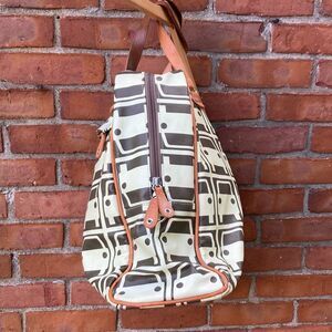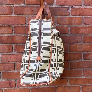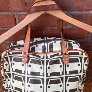Trendy backpack with a car print design. Features tan accents and a spacious interior.
