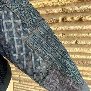 Various different textures, applications embroidered accents etc in a patchwork style. Some of the applications are sheer