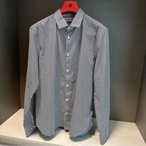 Orlebar Brown Giles Cotton Shirt in blue/white striped pattern with Spread collar, Long sleeves with button cuffs, and Button closure at front. 100% Cotton. Made in Italy. Size XXL. Worn once and in excellent condition.