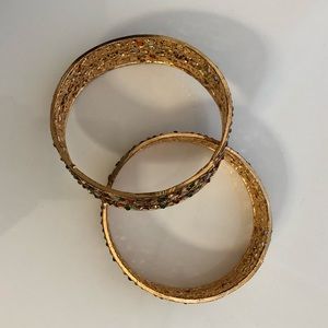 2 ornately decorated gold/brass-colored bangles with red, green, clear, and nude colored stones. Rope patterns in metal and flower/star shapes in crystal patterns.
