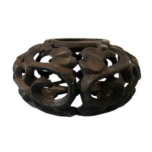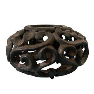 This cast iron decorative candle holder features intricate scrollwork, adding elegant charm to any space.