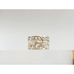Lovely sterling silver vintage cutout ring. The ring features swirly and floral accents along the entirety of the shank. Straight cut. Slightly textured. Can be stackable!