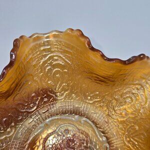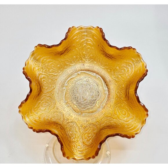 Stunning marigold intricate persian lace stamped glass dish by FentonGlass Company with ruffled rim. Stunning marigold color with an iridescent finish. No chips or cracks. Meticulous condition.